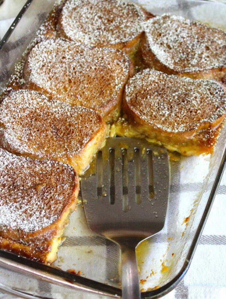 Let the French toast bake cool slightly (about 5–10 minutes). To serve, carefully invert portions onto plates so that the caramel layer is on top — just like an upside-down cake!