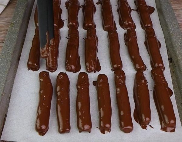 - Place the dipped sticks back on parchment paper and allow the chocolate to set. You can place the tray in the refrigerator for 10 minutes to speed up the process.