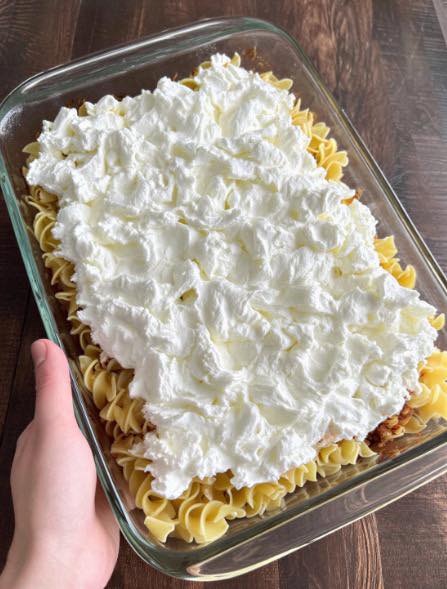 Preheat the oven to 375°F (190°C). Bring a large pot of salted water to a boil and cook the noodles according to package directions until just al dente. Drain and set aside. - Prepare the beef mixture