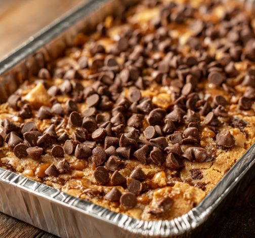 Remove from the oven and immediately sprinkle the chocolate chips evenly over the hot caramel layer. Let sit for 2–3 minutes, then gently spread the melted chocolate into an even layer.