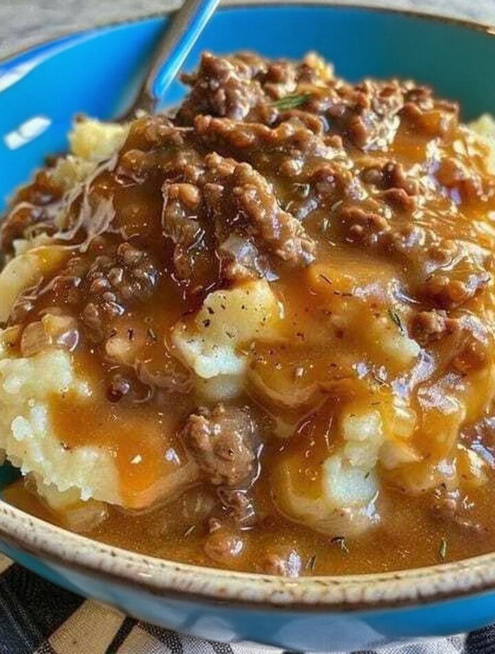 A hearty, comforting classic that brings warmth to every bite! Creamy mashed potatoes topped with rich, savory ground beef gravy make this dish a perfect family dinner — easy, budget-friendly, and incredibly satisfying.