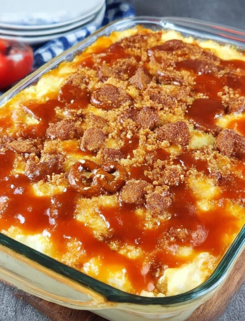 Before serving, you can add a sprinkle of crushed pretzels or a drizzle for extra texture and flavor.