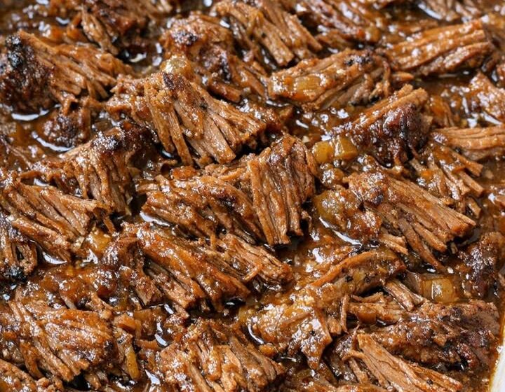Place in the oven and bake for 3–4 hours. The longer it cooks, the more tender it becomes. You’ll know it’s ready when the meat easily pulls apart with a fork.