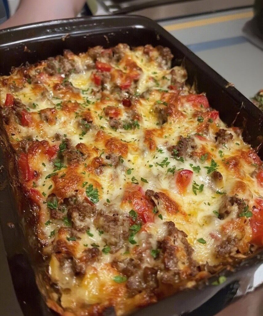 This Philly Cheesesteak Casserole brings everything you love about the iconic sandwich into one easy, cheesy, oven-baked dish. Tender beef, sautรฉed peppers and onions, and melted provolone come together for a hearty meal thatโs pure comfort food โ no roll required!